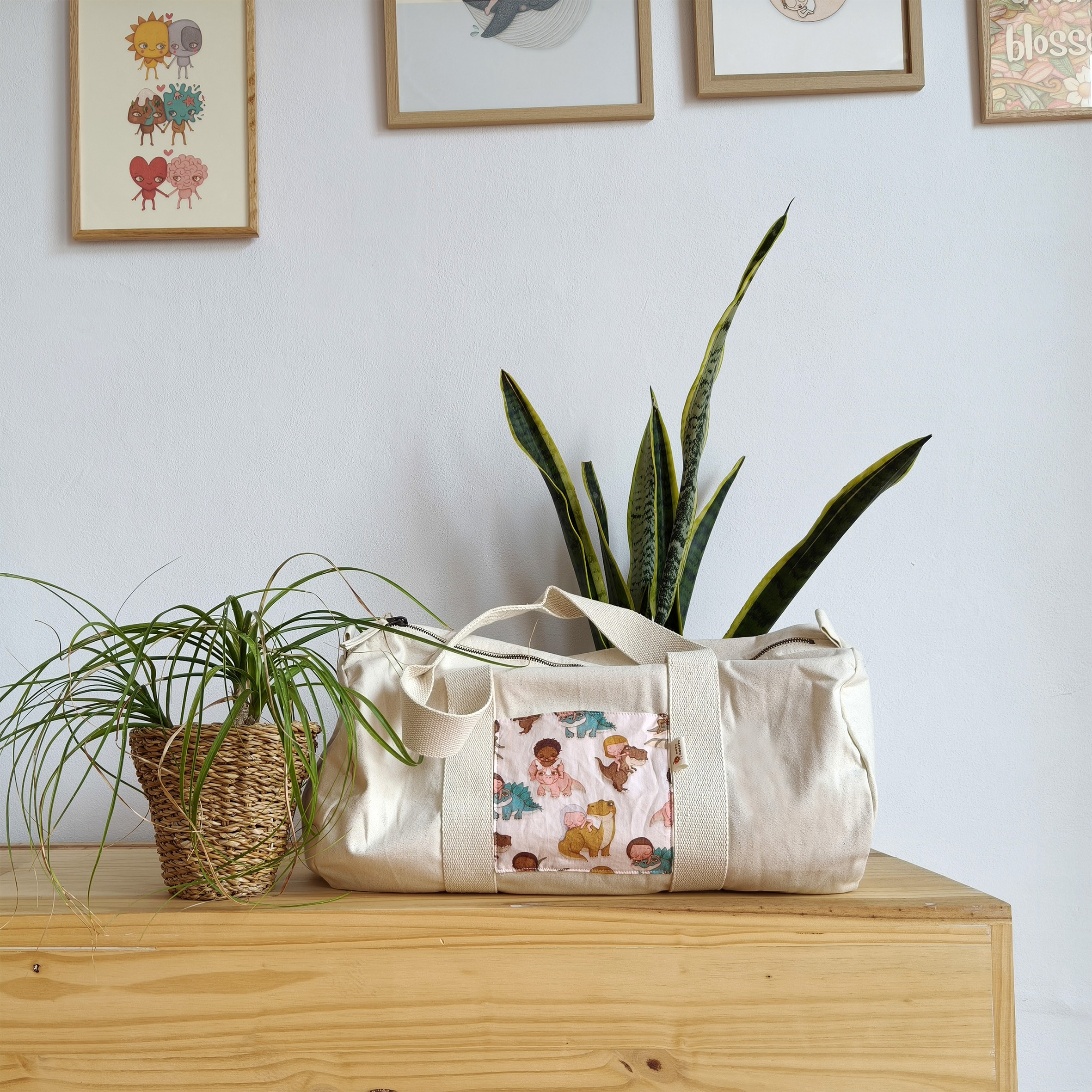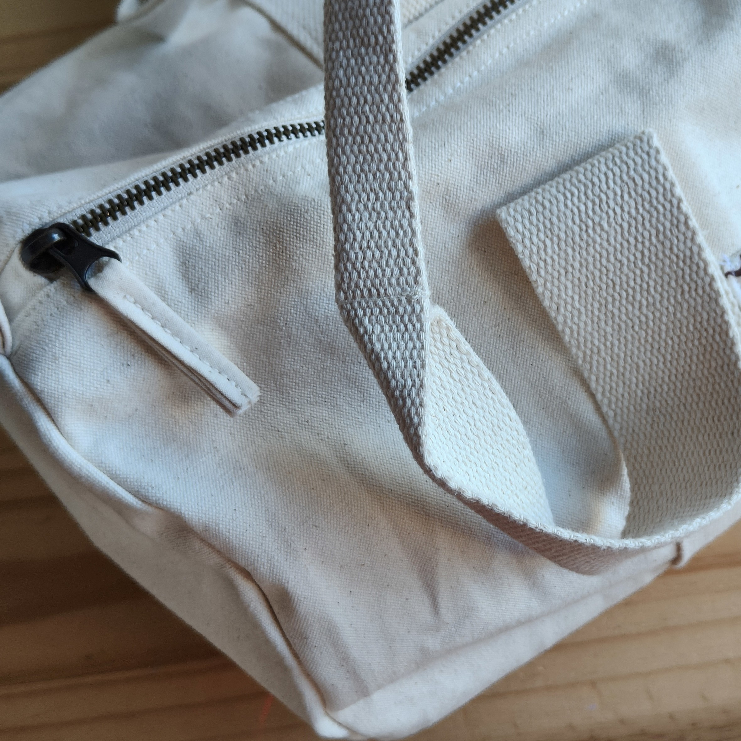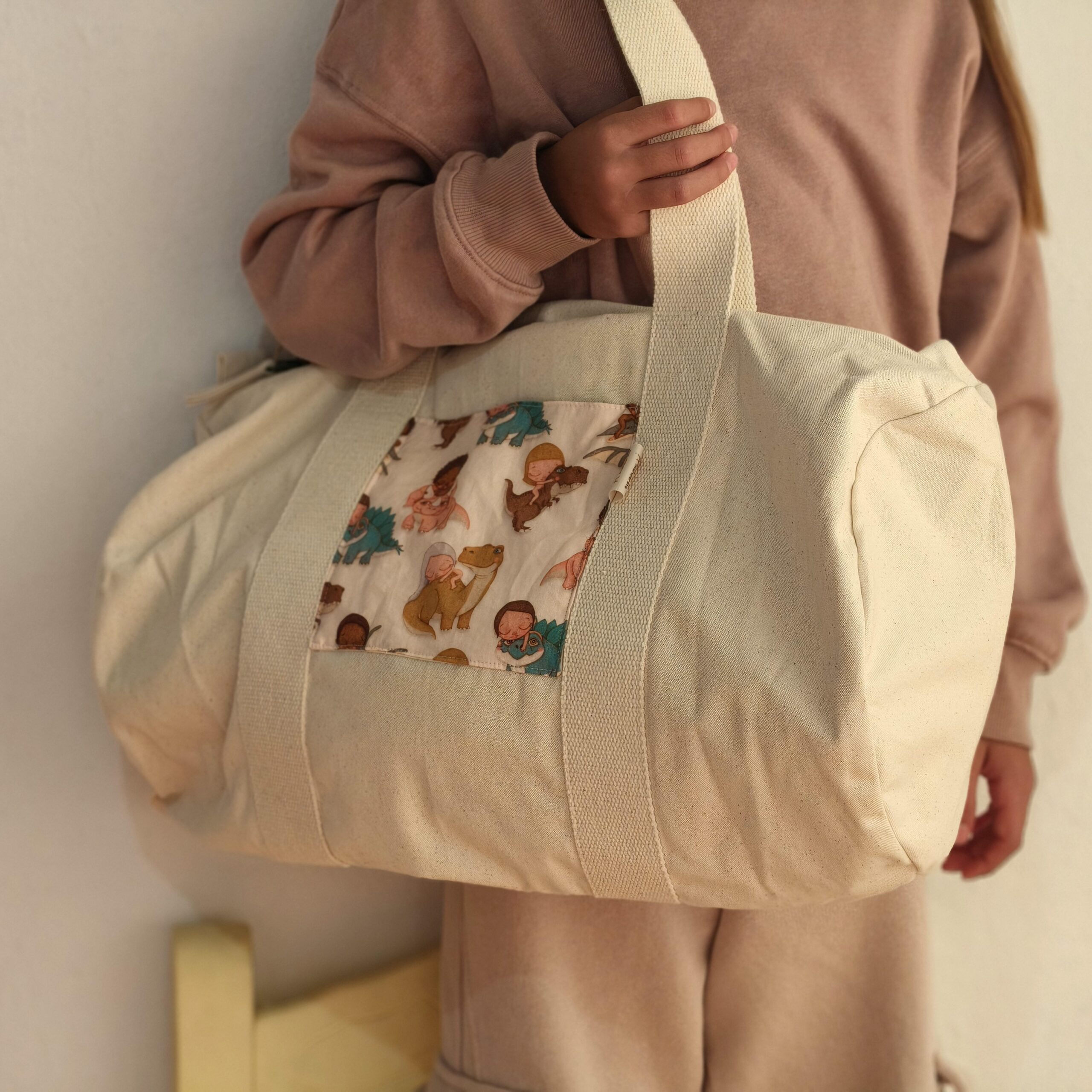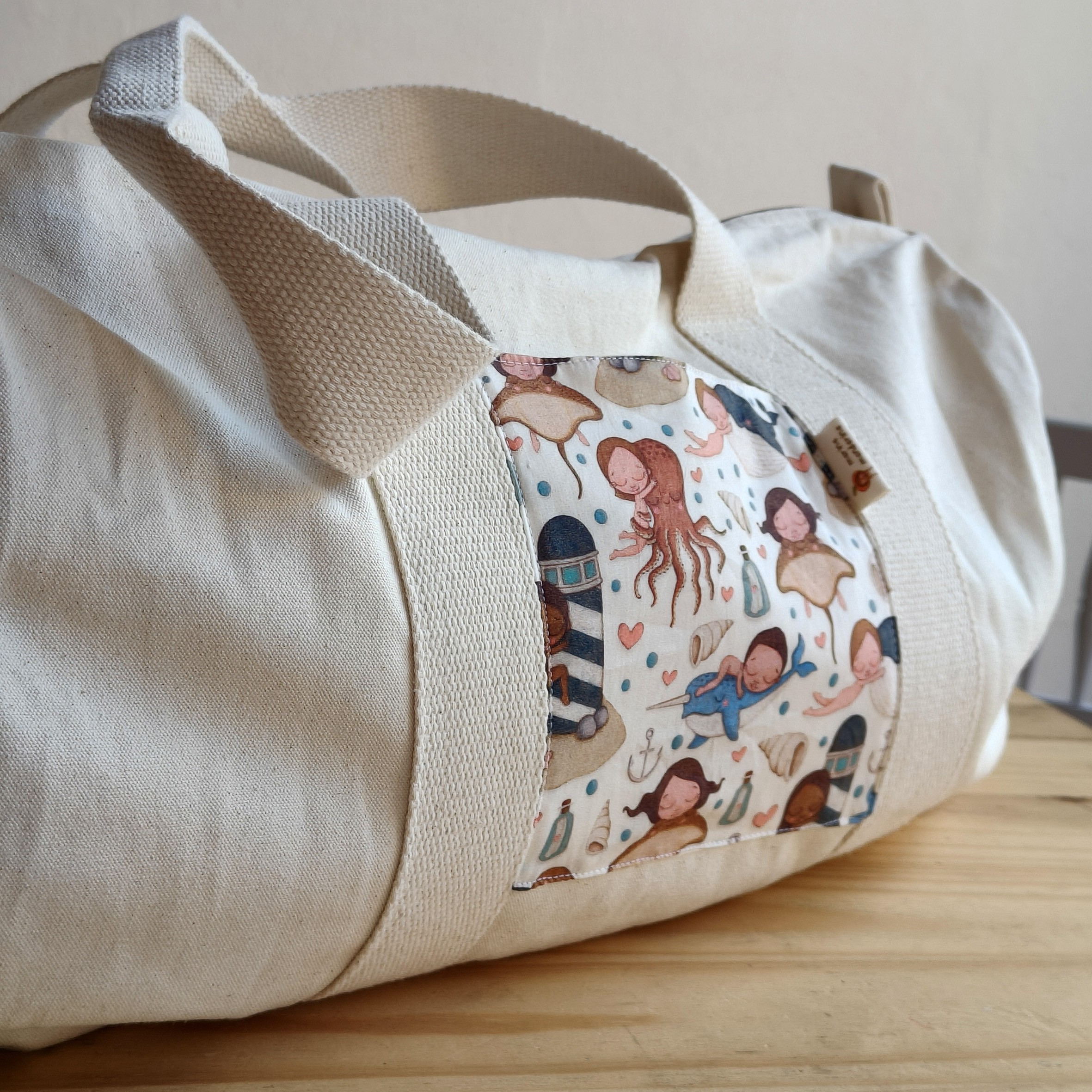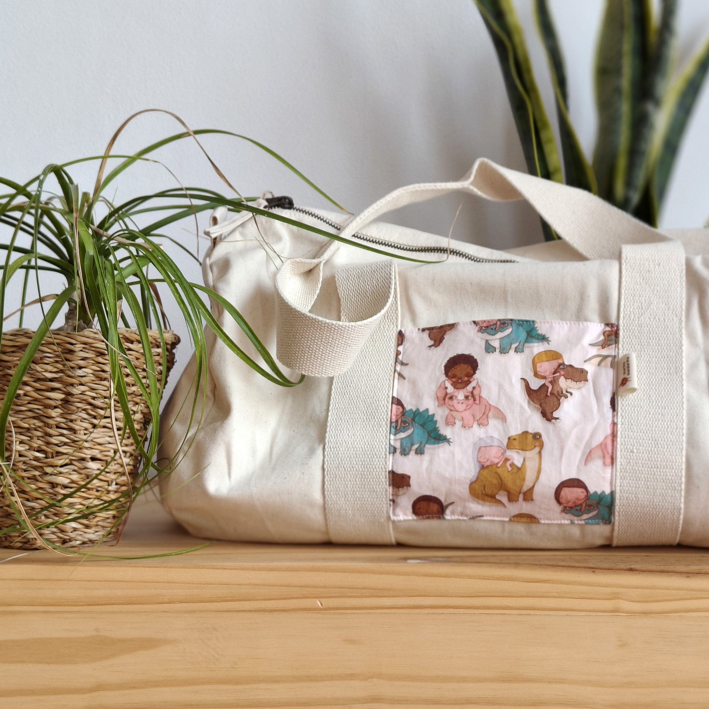 Bolsa de deporte o viaje, tipo barril, elaborada con tejido de loneta de algodón orgánico de color natural (beige).
