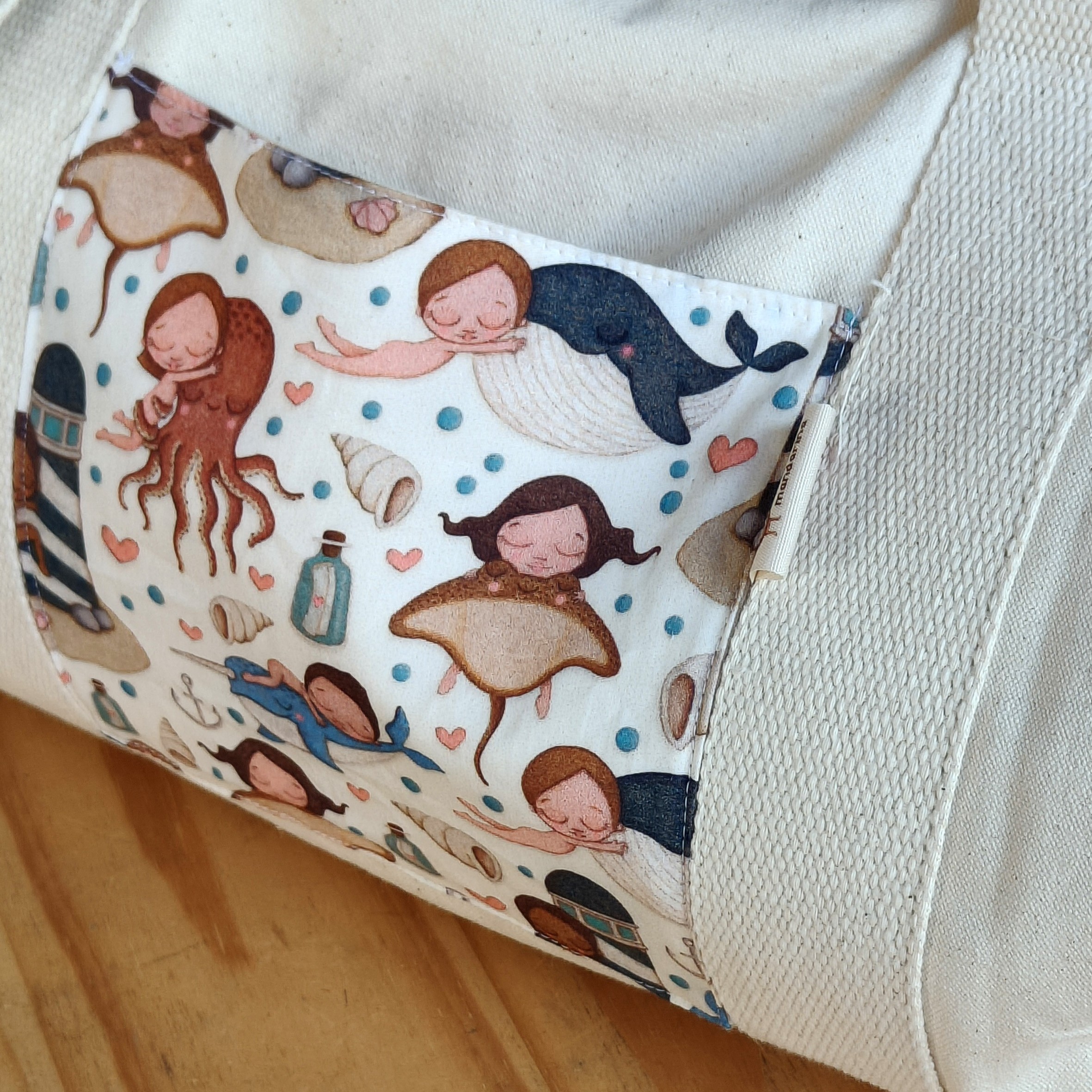 Con bolsillo estampado , cremallera metálica y asas.