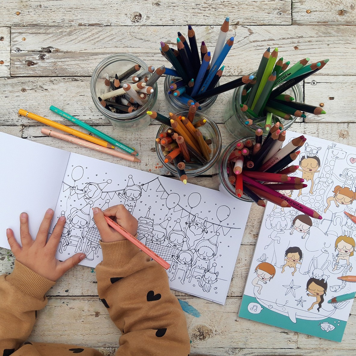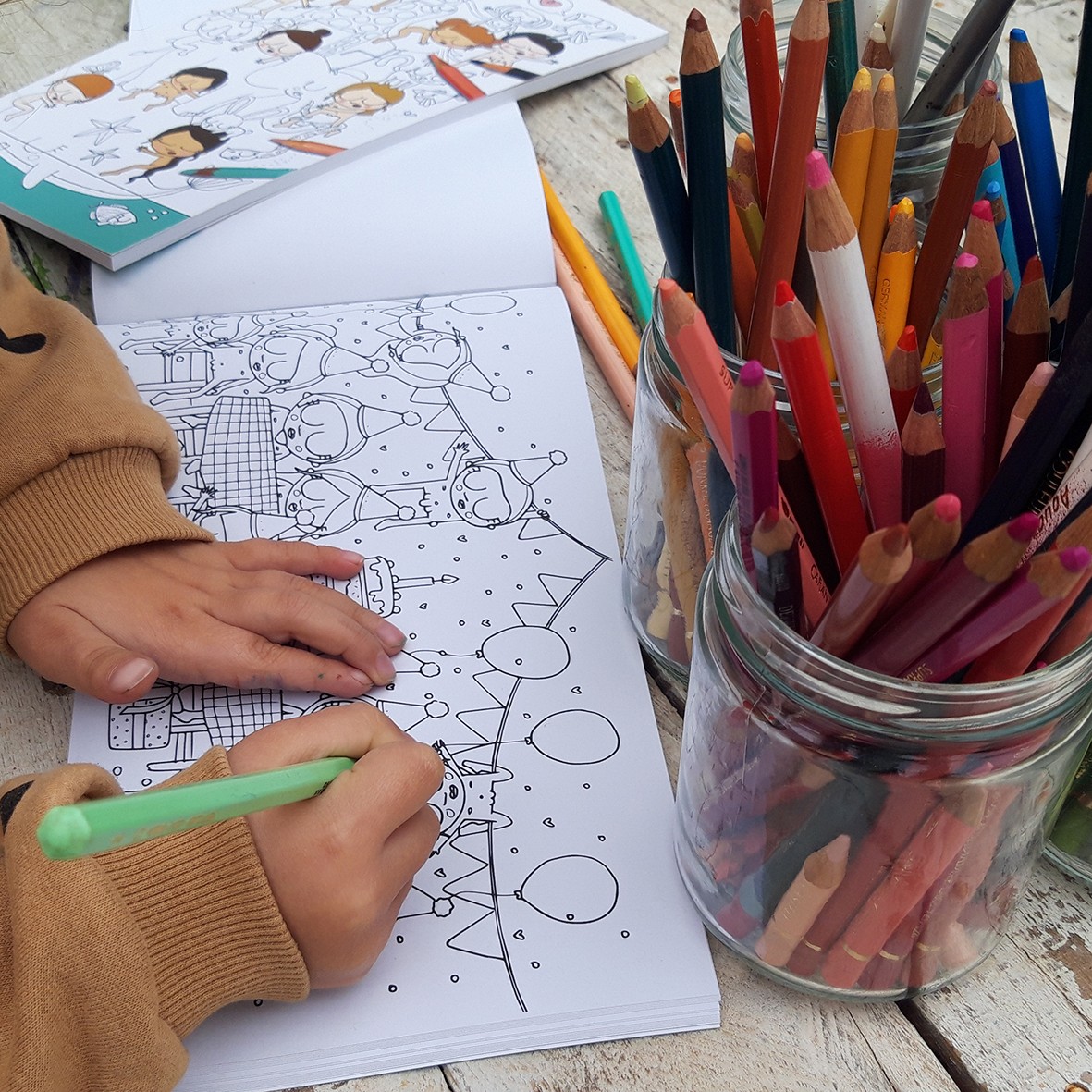 Un cuaderno compuesto de 20 ilustraciones de temáticas diferentes, como por ejemplo: el mar, un picnic, una fiesta de cumpleaños o un viaje por el espacio….