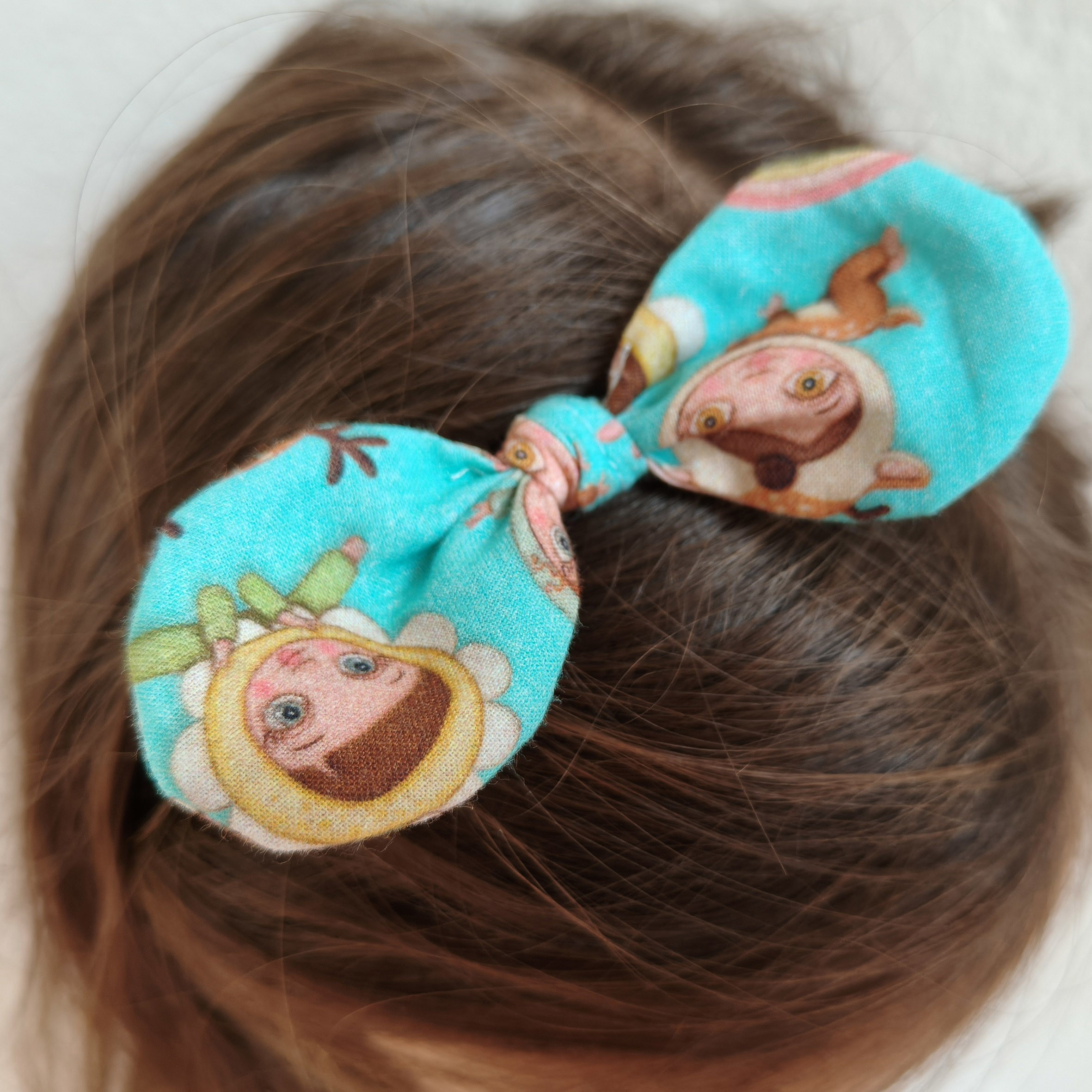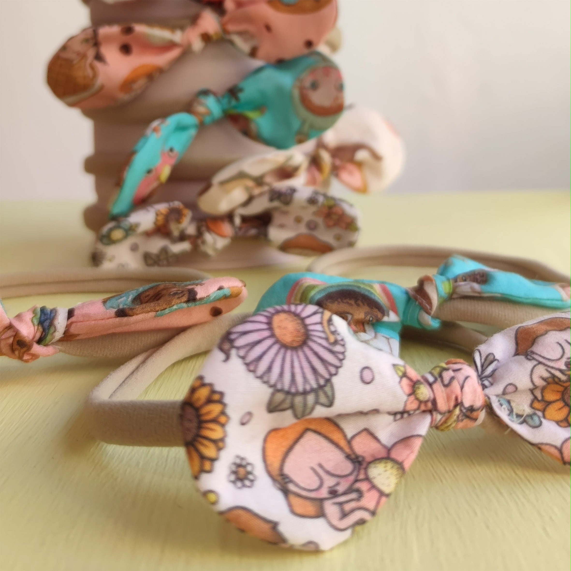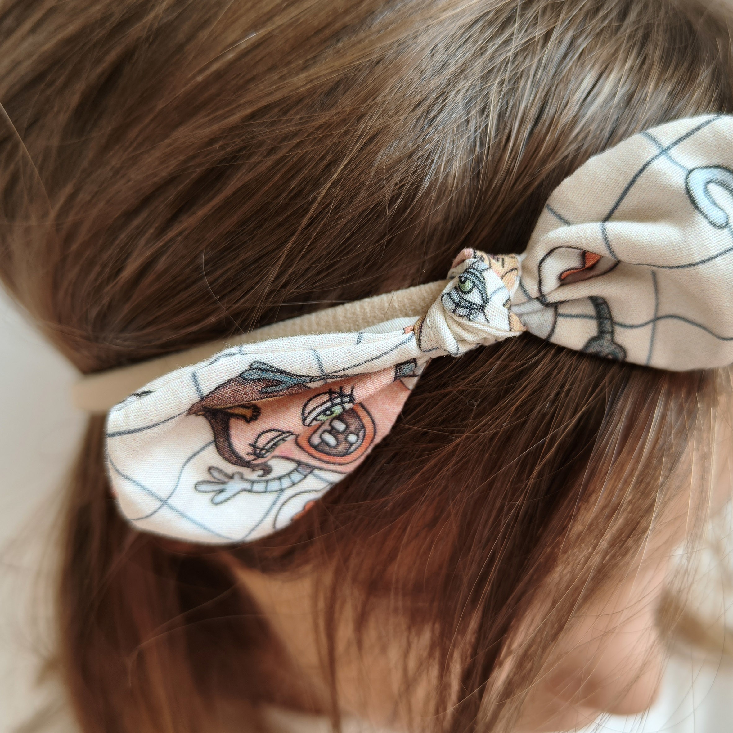 Diadema de goma de color beige, muy elástica, flexible y adaptable, con lacito estampado.