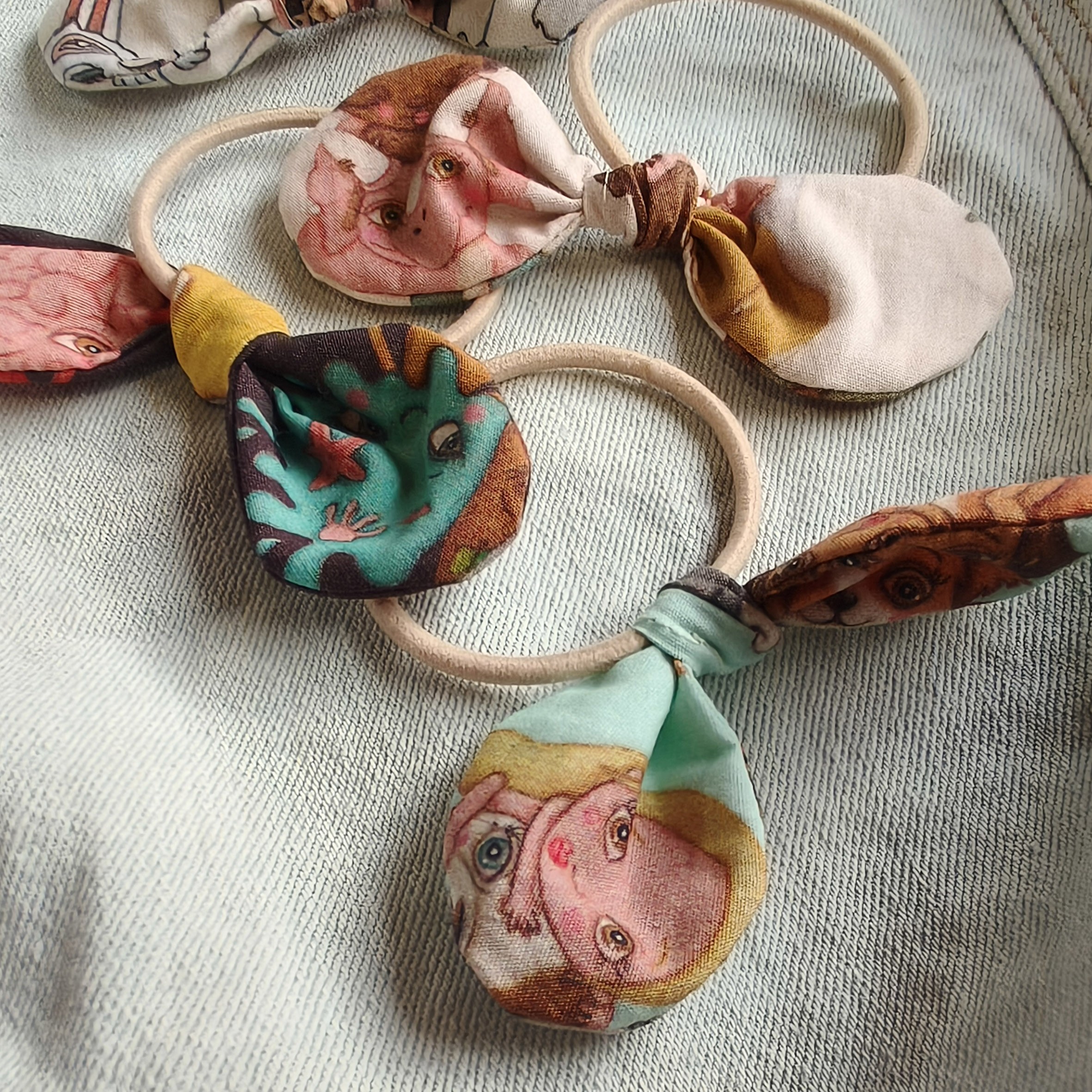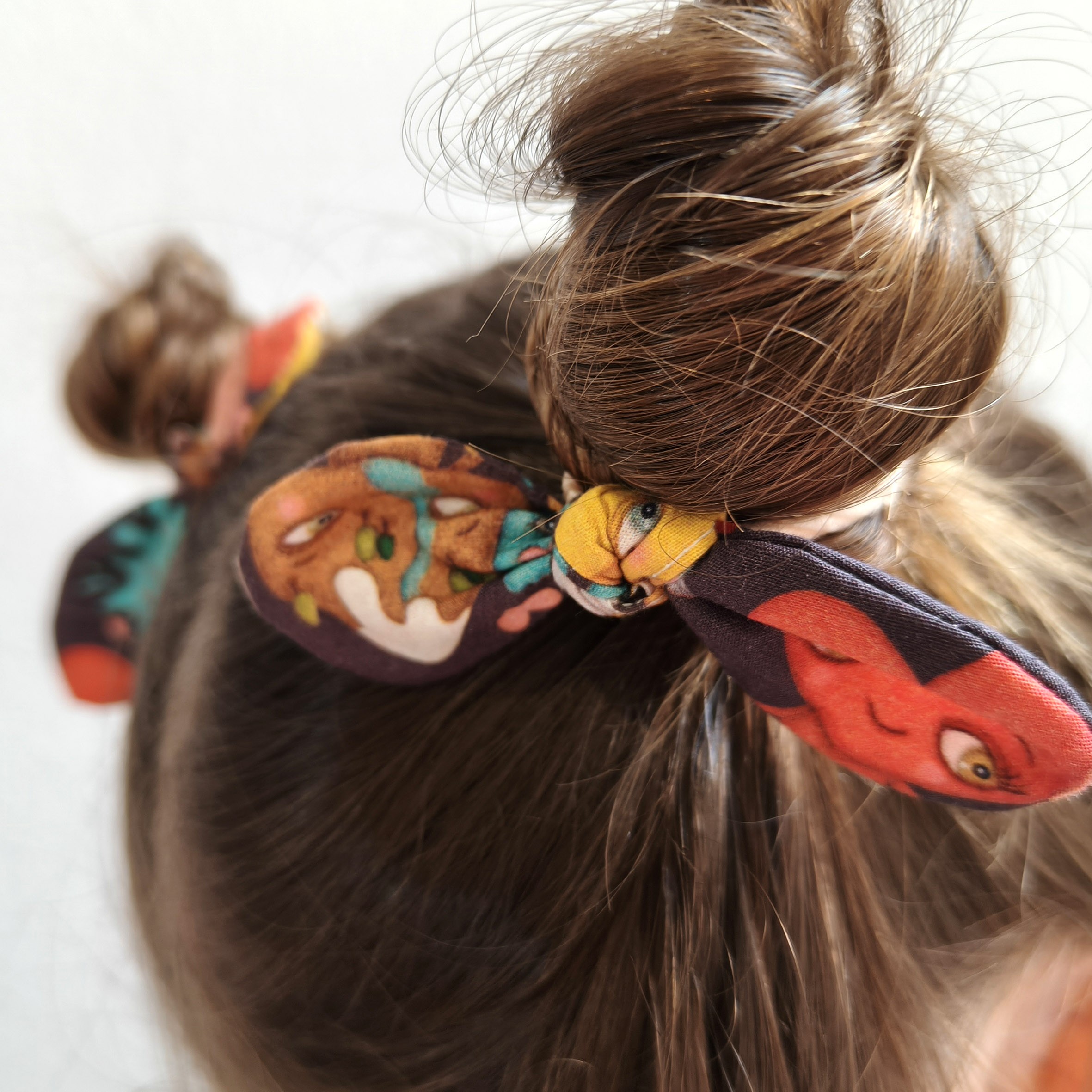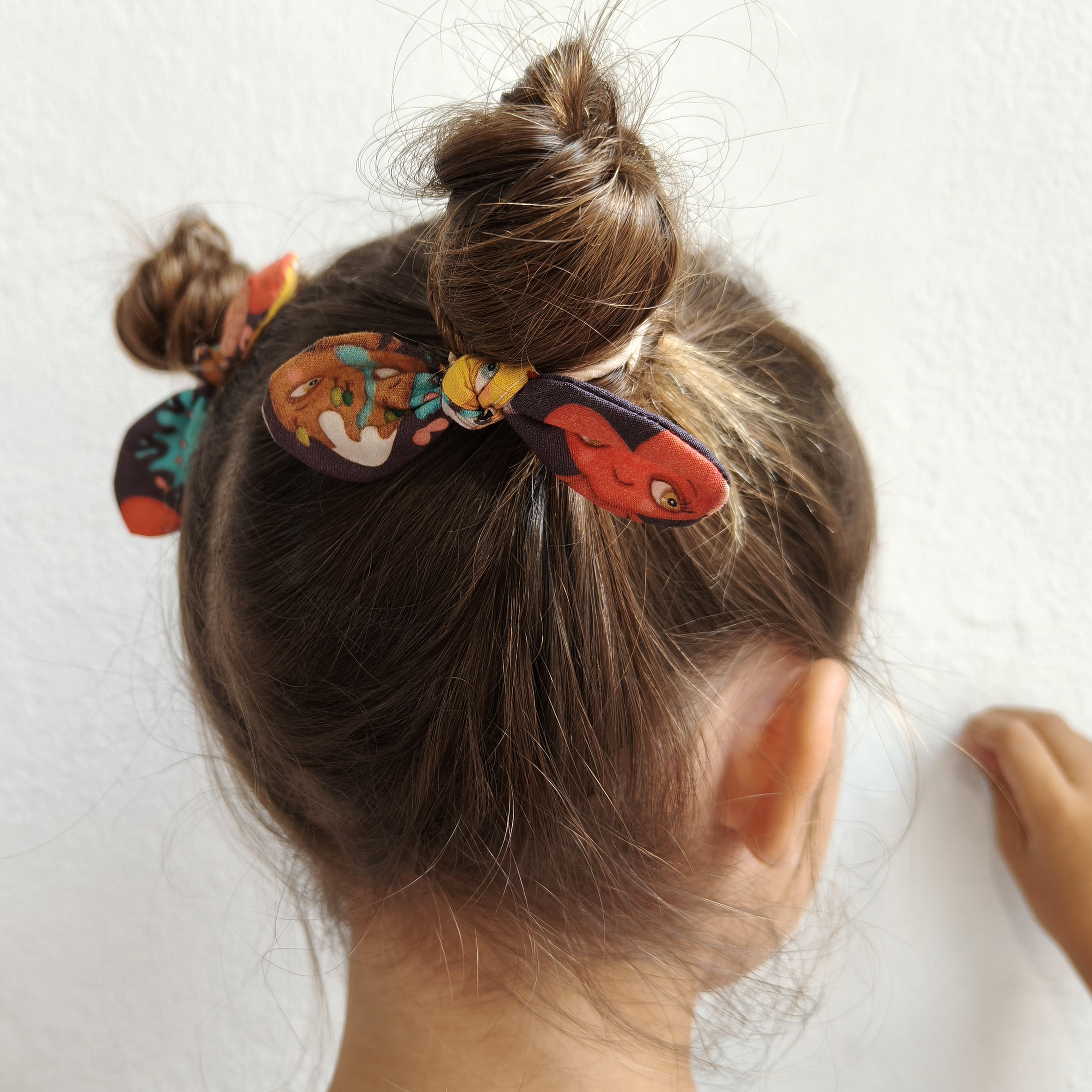 Goma para el pelo de color beige y elástica, con lacito estampado de algodón orgánico.