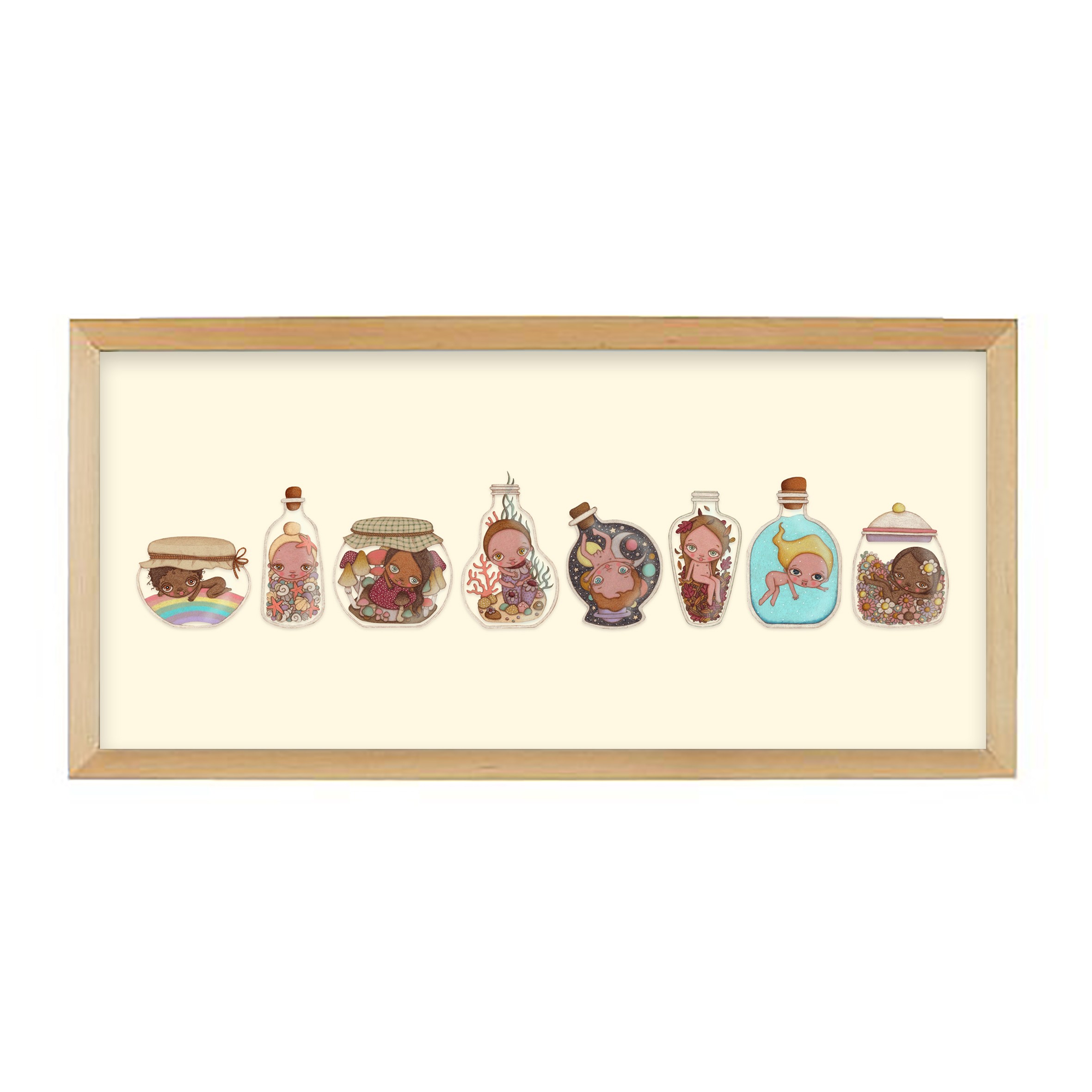 Ilustración donde aparecen representadas diferentes botellitas que contienen personitas y diferentes elementos y maravillas de la naturaleza.