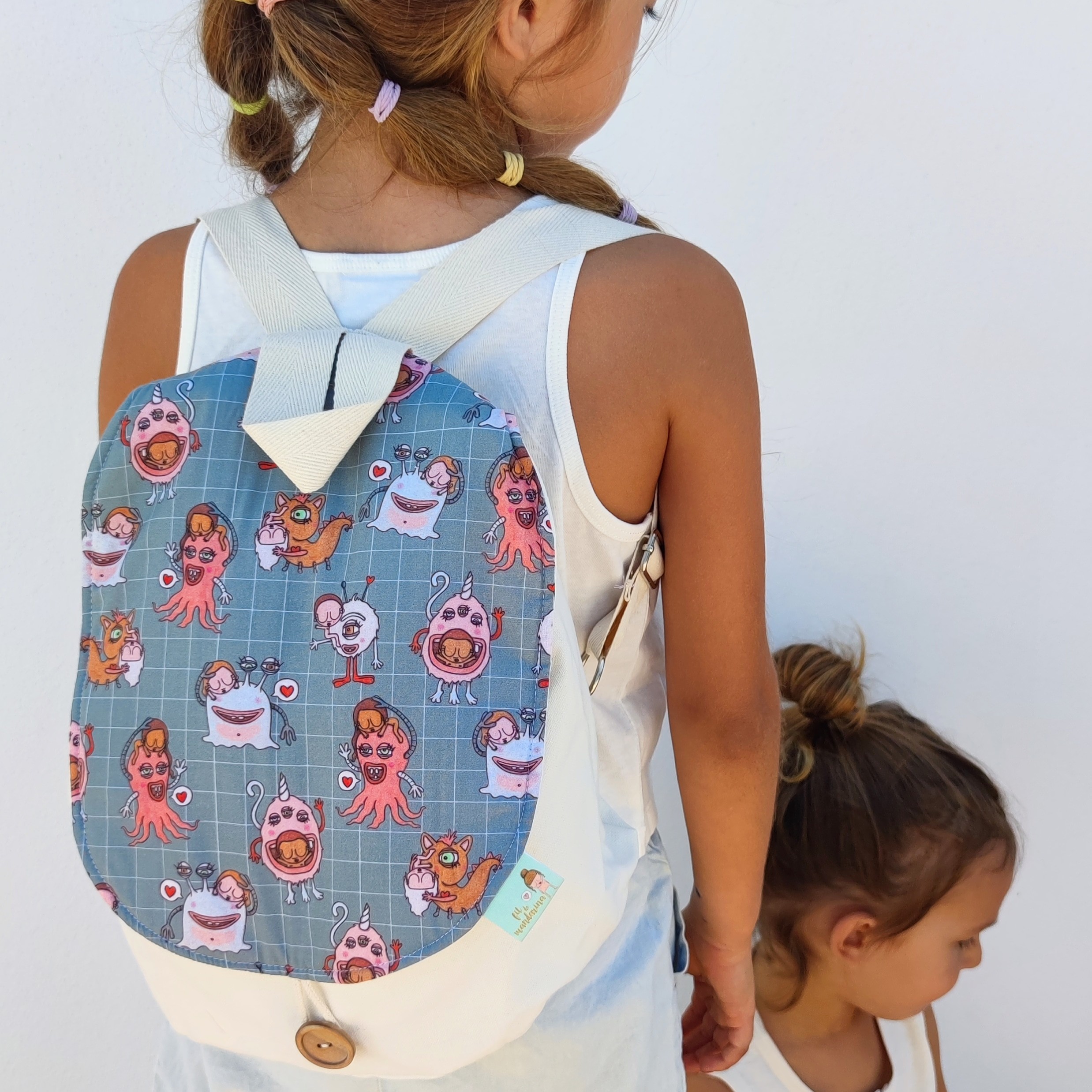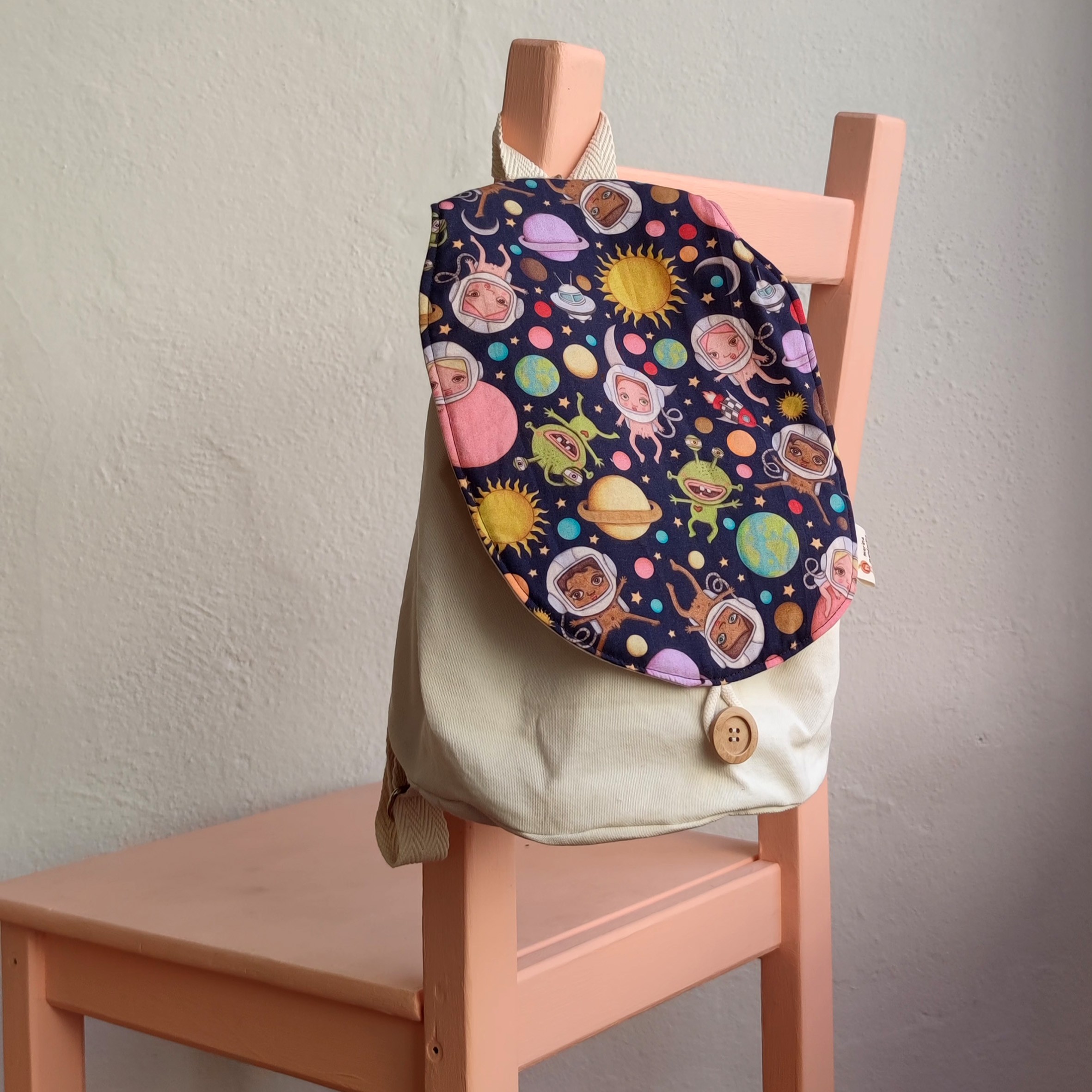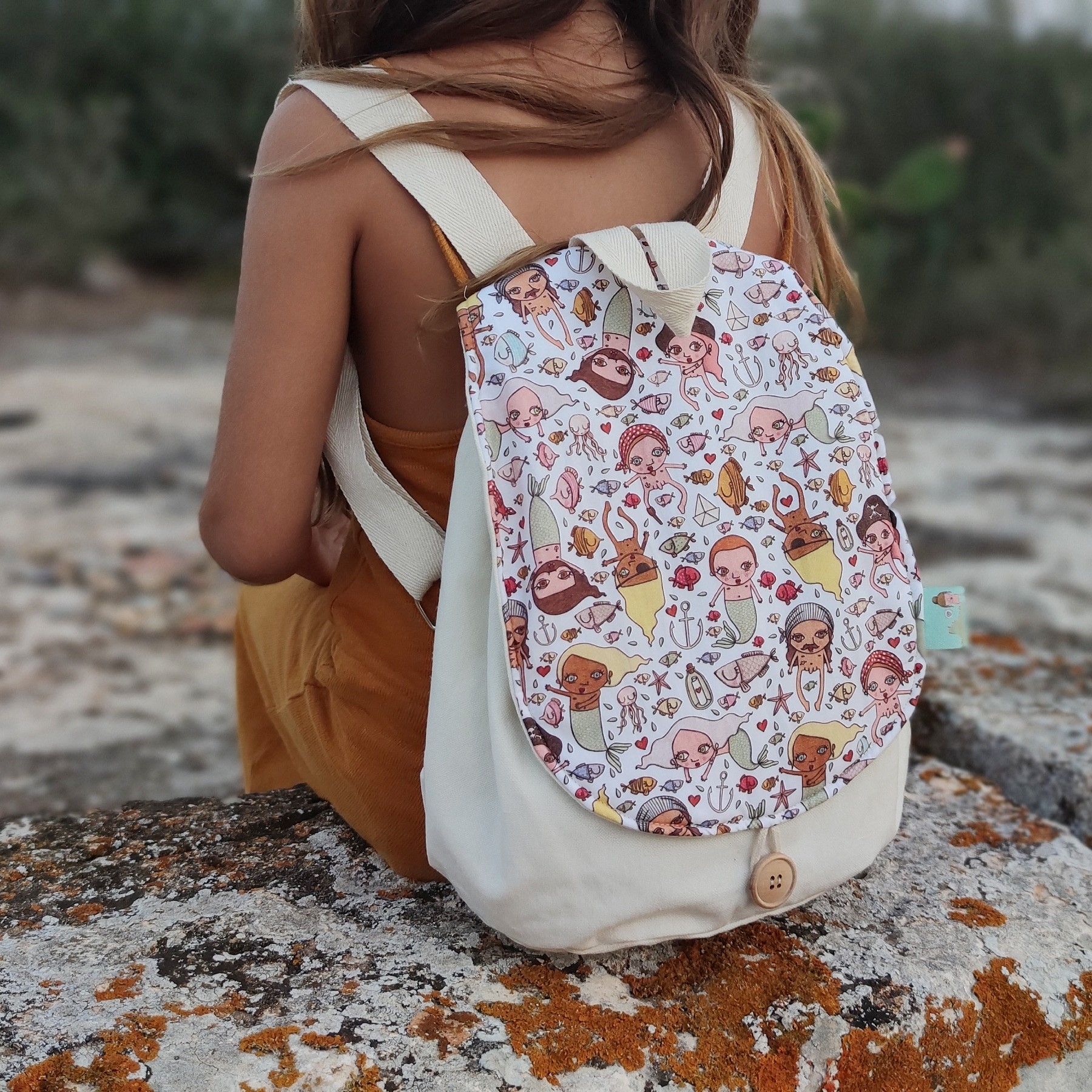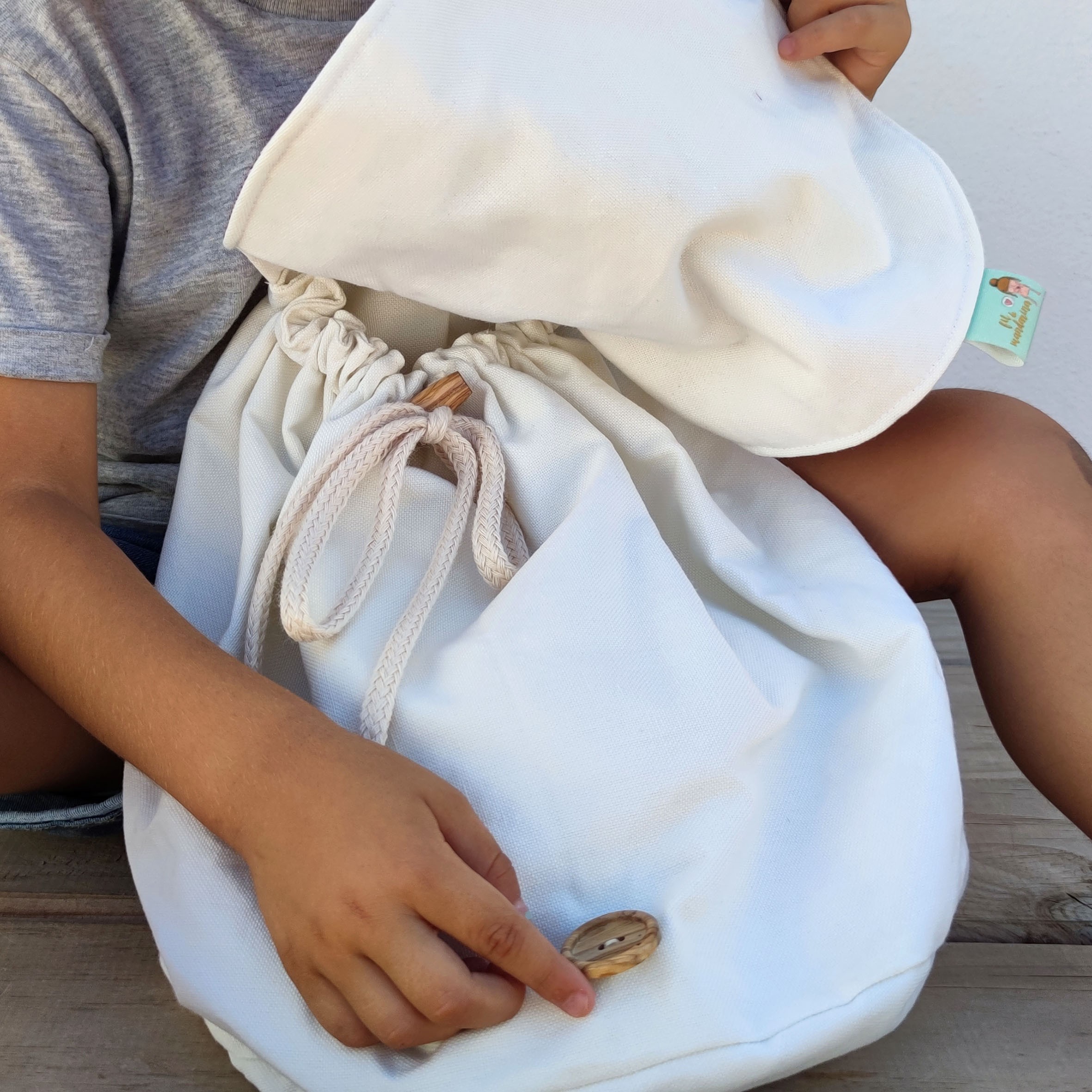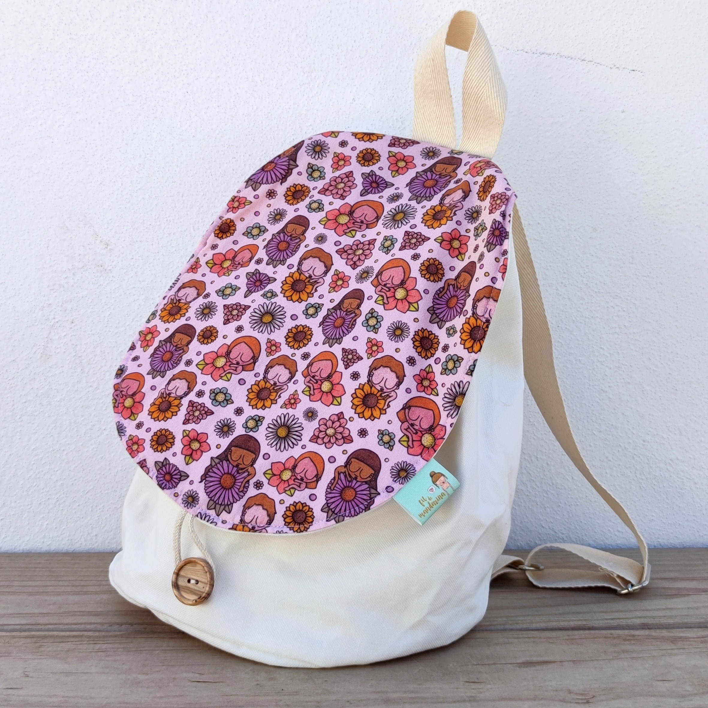 Mochila elaborada con tejido de loneta reciclada de 260g, de color crudo y con una solapa estampada semirrígida elaborada con tejido de algodón 100% orgánico.